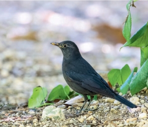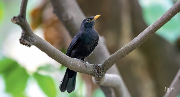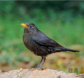 鉴别特征:体长约29 cm。雄鸟体羽几乎全部黑色,喙及眼圈橘黄色。雌鸟多暗褐色,喉部及胸部具不明显的暗色纵纹。