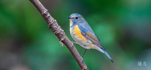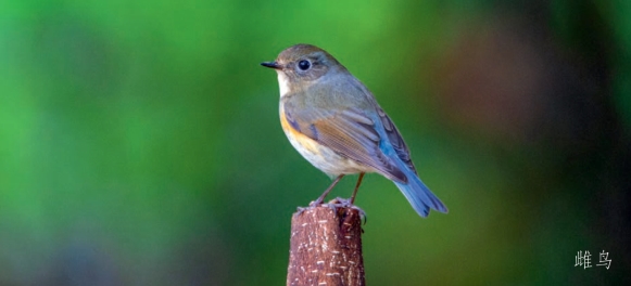 鉴别特征:体长约15 cm。雄鸟上体蓝色,两胁橘黄色,具白色细短眉纹和闪蓝色小覆羽,喉部及下体白色。雌鸟上体褐色,腰部及尾羽淡蓝色。
