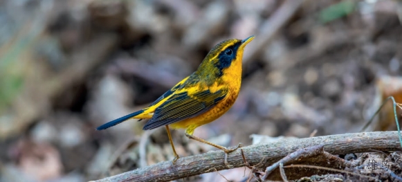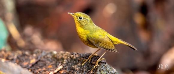 鉴别特征:体长约14 cm。雄鸟上体橄榄褐色,眉纹、喉部及胸部金黄色,腰部及下体余部均为橘黄色。脸罩黑色,翼缘及外侧尾羽基部橙黄色。雌鸟上体橄榄色,下体艳黄绿色。