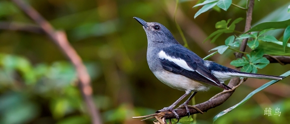 鉴别特征:体长约20 cm。雄鸟头部、胸部及背部深蓝黑色,翼及尾羽黑色,宽大的翼斑及外侧尾羽均为白色,下体余部白色。雌鸟多灰色和白色,亚成鸟肩部及胸部满布褐色杂斑。erimelas 亚种外侧第四对尾羽的内、外翈边缘均为黑色。
