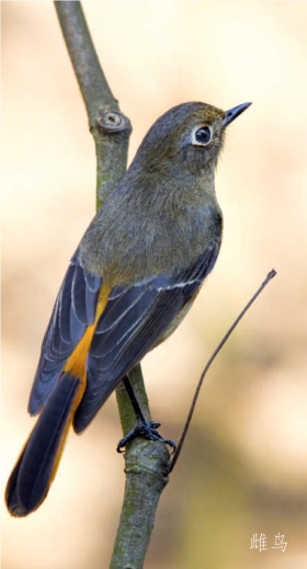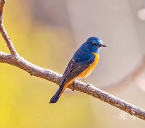 鉴别特征:体长约16 cm。雄鸟头部至上背部及上胸部均为深蓝色,两翼及尾羽黑褐色,下背部、腰部及外侧尾羽基部均为橙褐色,下体余部橙黄色。雌鸟褐色,眼圈皮黄色,腰部和外侧尾羽基部橙褐色。