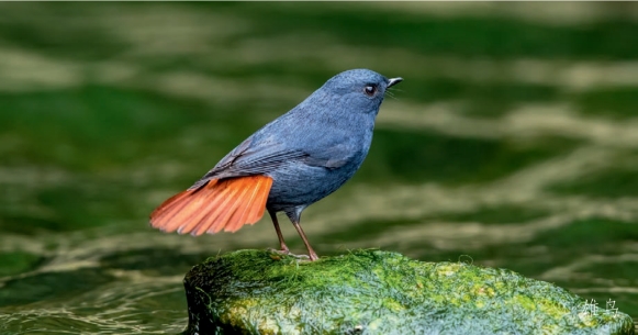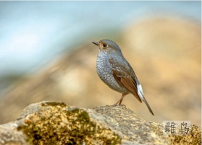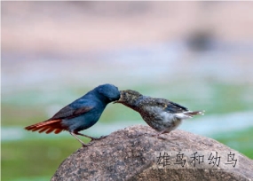 鉴别特征:体长约14 cm。雄鸟通体深青石蓝色,腰部及尾羽栗褐色。雌鸟上体灰色,下体具灰白色鳞斑,翼黑褐色并具两道白色点状翼斑,腰部及外侧尾羽基部均为白色。