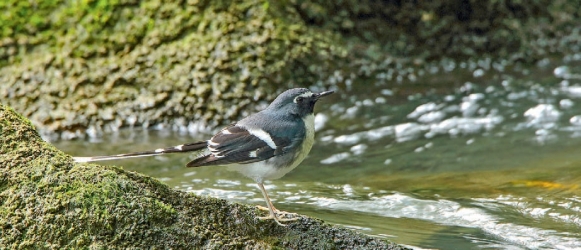 行为:性活跃,常成对于山间溪流或瀑布旁的岩石上觅食昆虫,尾羽会有节律地上下摆动。