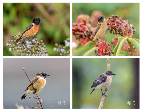 鉴别特征:体长约14 cm。雄鸟头部及上体黑色,颈侧和翼具显著白斑,胸部及两胁棕色,腰部白色。雌鸟呈褐色,背部具棕色羽缘,喉部近白色,下体皮黄色。przewalskii亚种下体棕色较浓。