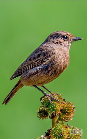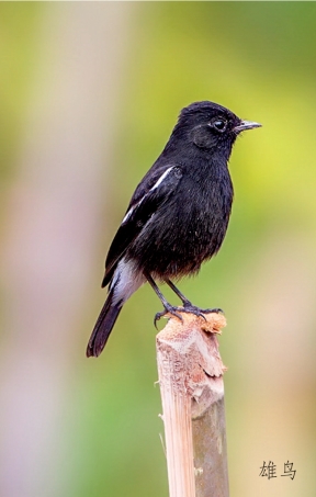 鉴别特征:体长约14 cm。雄鸟全身黑色,仅翼斑、腰部及尾下覆羽白色。雌鸟呈暗褐色,腰部浅褐色。