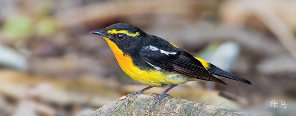 鉴别特征:体长约13 cm。雄鸟上体黑色,具白色翼斑,眉鲜黄色,下体橘黄色。雌鸟整体色灰暗。