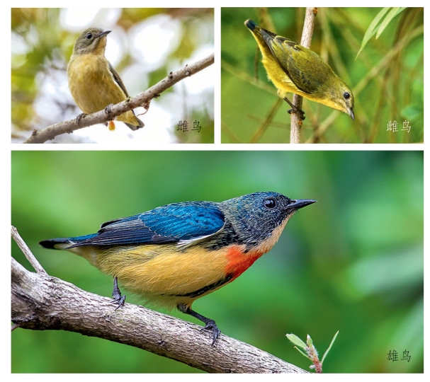 鉴别特征:体长约7 cm。雄鸟背部蓝黑色,具红色的胸部,腹部皮黄色,并具一条明显的黑色纵纹。雌鸟背部橄榄绿色,胸腹部偏棕黄色。