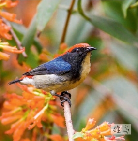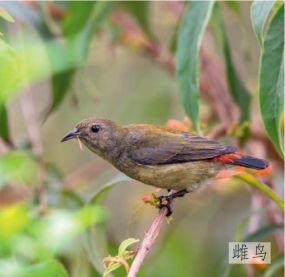 鉴别特征:体长约9 cm。雄鸟脸部、颈侧及尾部黑色,但头顶、背部及腰部明红色,下体偏白色。雌鸟偏橄榄绿色,但腰部浅红色。