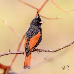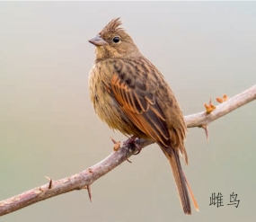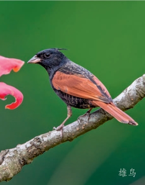 鉴别特征:体长约17 cm。雄鸟体羽偏辉黑色,具黑色的细长羽冠,两翼及尾羽栗色。雌鸟偏深橄榄褐色,羽冠较短,羽缘栗色。