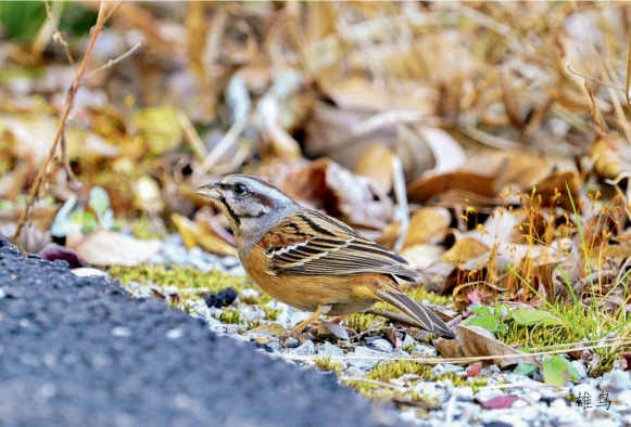 鉴别特征:体长约16 cm。雄鸟头部灰色,具多条栗色头纹,背部及下体棕褐色,翼上具两道翼斑。雌鸟色泽稍暗淡。