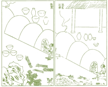 凡缸、瓶窑不于平地,必于斜阜山冈[6]之上,延长者或二三十丈,短者亦十余丈,连接为数十窑,皆一窑高一级。盖依傍山势,所以驱流水湿滋之患,而火气又循级[7]透上。其数十方成陶者,其中苦无重值物,合并众力众资而为之也。其窑鞠成之后,上铺覆以绝细土,厚三寸许。窑隔五尺许,则透烟窗,窑门两边相向而开。装物以至小器装载头一低窑,绝大缸瓮装在最末尾高窑。发火先从头一低窑起,两人对面交看火色。