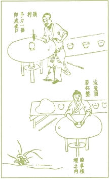 制作圆器的瓷坯需要使用陶车。将泥土堆放到陶车的盔头上,旋转圆盘,用手指按压泥底,随着圆盘的转动,泥土很快就变成杯碗的形状了。