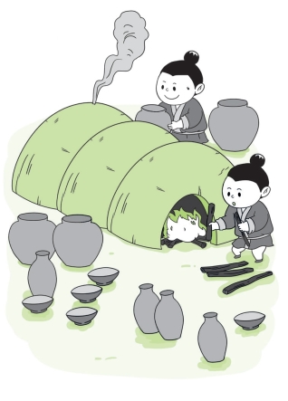 烧制陶器时,小的放在低矮处的窑里,大的放在高处的窑里。从最低的窑开始起火,而且要安排两个人专门观察火候。等到火候足够时,就关闭窑门,接着烧第二个窑,这样一个接着一个,直到把最高处的窑烧好。