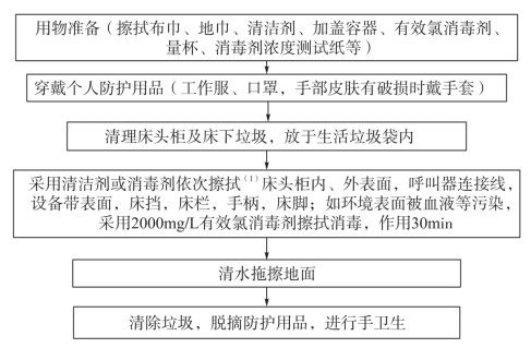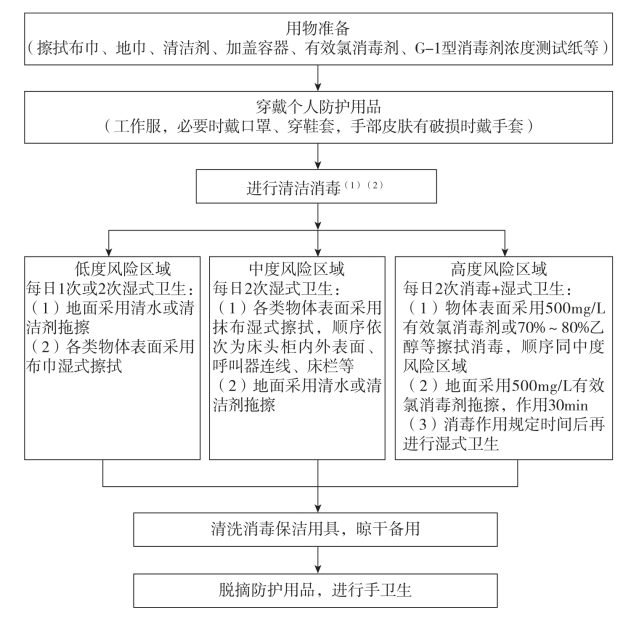 注:(1)当发生(疑似)医院感染暴发、环境表面检出多重耐药菌如耐甲氧西林金黄色葡萄球菌(MRSA)、耐碳青霉烯类肠杆菌科细菌(CRE)等,或发生特殊感染时,进行强化清洁与消毒。