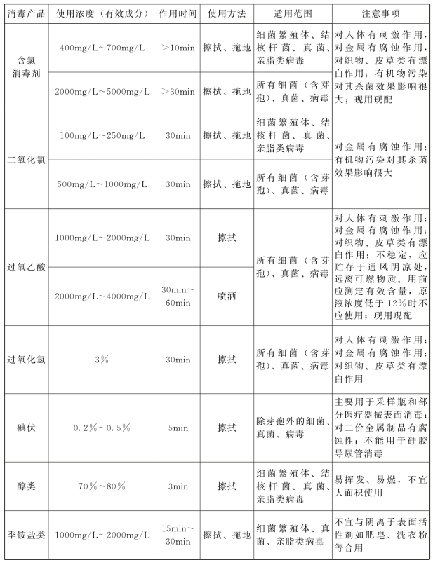 注:(1)消毒液种类、浓度选择参考本章“表3-8环境表面常用消毒剂”的相关内容。