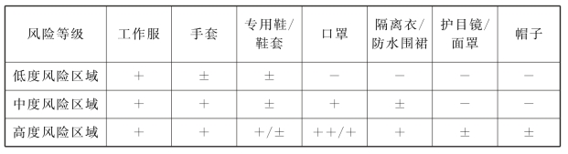 注:(1)“++”表示应使用N95口罩,“+”表示应使用,“±”表示可以使用或按该区域的防护要求使用,“-”表示可以不使用。