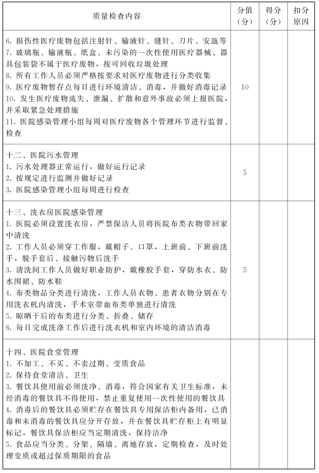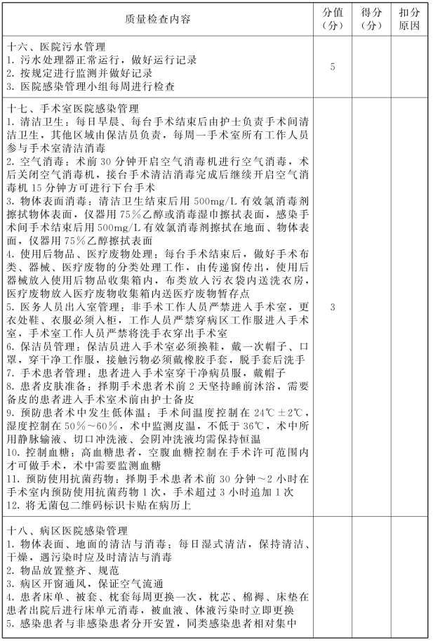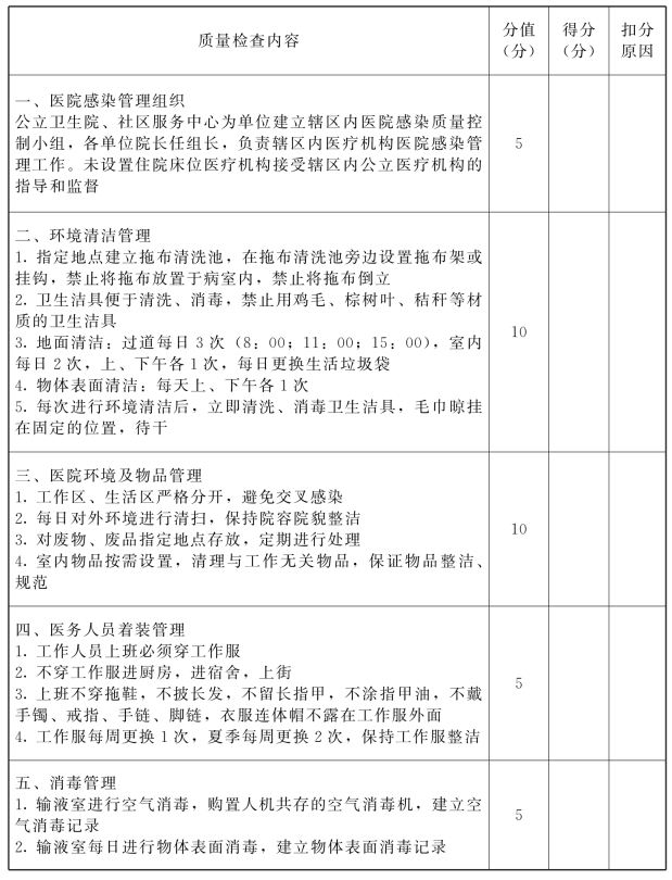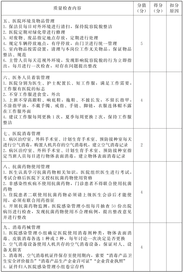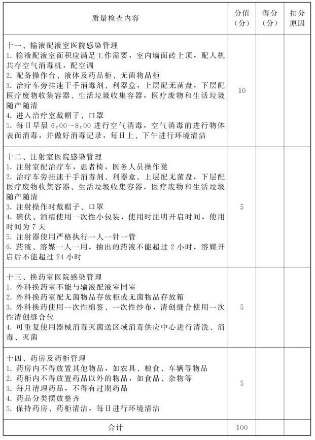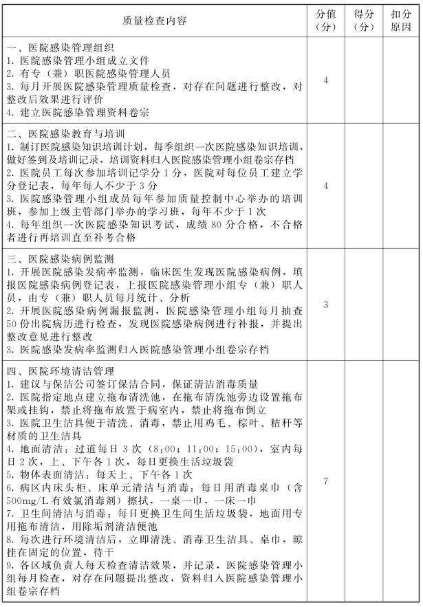 100张住院床位以下基层医疗机构医院感染管理质量检查表的具体内容见表14-4。
