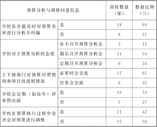 预算执行分析是高校定期对预算执行的情况进行分析、评估、监督和控制,分析当期实际发生的数据和预算数据之间的差异,明晰差异的原因,并确定是否要对预算进行调整,制定改进措施,及时解决预算执行中遇到的问题。从调查结果来看(如表3-8所示),37%的受调查者反映其所在学校在预算执行过程中,发现实际情况与预算有差异时,不能及时对差异进行分析并采取措施。34%的财经类应用型高校会定期召开预算分析会,54%的财经类应用型高校偶尔召开预算分析会,12%的财经类应用型高校从不召开预算分析会。65%的受调查者反映其所在学校在预算执行过程中,上下级部门对经费的使用和项目的进展情况不会经常交流,只是在必要时才进行交流。而且,27%的受访者反映其所在学校不会定期(如每年)评审供应商,由此也就无法有效控制学校物资采购的风险。预算执行分析是有效发挥预算功能的重要制度保障,从表3-8的这一数据来看我国财经类应用型高校对预算分析的重视程度需要提高。就预算调整而言,考虑到预算管理的严肃性,预算在执行过程中不能朝令夕改、频繁变更。而当高校的内外部环境发生重大变化时,比如学校整体事业发展规划、社会对财经类人才的需求、校内重大项目发生变化,学校就应该及时调整预算,以保证预算的科学时效性和可执行性。从调查结果来看,42%的受调查者反映其所在学校在预算执行过程中经常会对预算进行调整。在此情况下,企业预算调整过于频繁可能会引起预算松弛问题,预算的控制功能会被削弱。92%的受调查者反映其所在学校在发生重要变化时(如重大项目、事业发展规划发生变化等)会及时调整预算。这表明我国财经类应用型高校比较重视内外部环境分析,会及时考虑到预算与实际情况的重大差异,并进行预算调整,提高预算的可执行性。