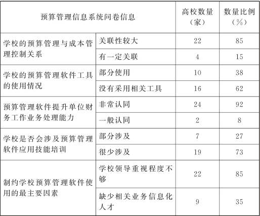 良好的信息沟通是预算有效执行的必要条件。只有良好的信息沟通,预算的差异才能得到及时的分析与调整。而预算管理信息系统可以实现对预算执行的过程控制。一方面,预算管理信息系统可以对各预算责任部门的预算执行情况进行及时信息预警。另一方面,多渠道信息反馈系统可以实现网络信息化跟踪监控,通过预算管理信息系统与会计核算系统的对接,自动计算预算执行进度比例,自动找出预算数和实际完成数二者间的差异。预算管理信息化越完善的企业,其预算管理与企业资源配置的合理程度越高,成本控制效果越好。从调查结果来看(如表3-9所示),85%的受调查者反映其所在学校预算管理与成本管理控制关联性较大。62%的受调查者反映其所在学校预算管理还停留在手工操作阶段,并没有预算管理软件工具。而在调研预算管理软件是否会提升单位财务工作的业务处理能力时,92%的受调查者表示非常认同,但73%的受调查者反映其所在学校在财务人员培养的过程中很少涉及预算管理软件应用技能培训。在调研制约学校预算管理软件使用的最主要因素时,85%的受调查者反映其所在学校领导重视程度不够,35%的受调查者反映其所在学校缺少相关业务信息化人才。