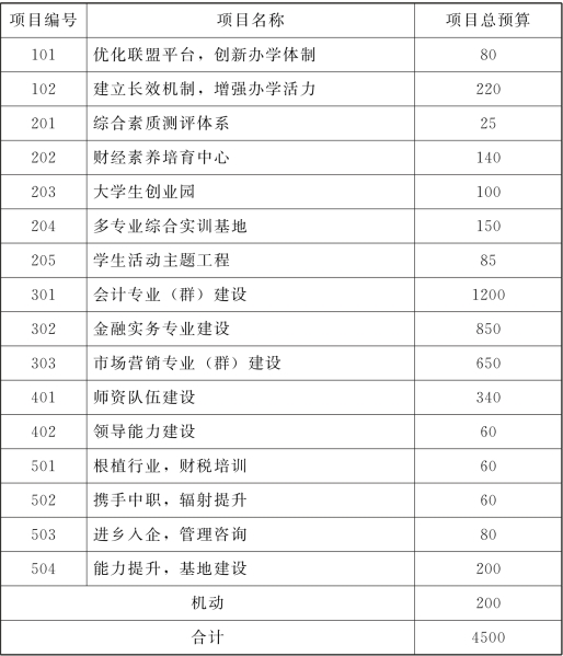 一方面,财经类应用型高校注重培养技能型人才,其教学管理中更强调实习实训的重要性,由此其预算项目资金安排中有关实习实训的规划要更加突出。以A财经类应用型高校为例,近年来就有大量有关示范建设项目和重点专业建设项目,如2014—2016年省级重点专业建设项目共投入600万元(见表4-3),2016—2018年省级示范建设项目共投入4500万元(见表4-4)。