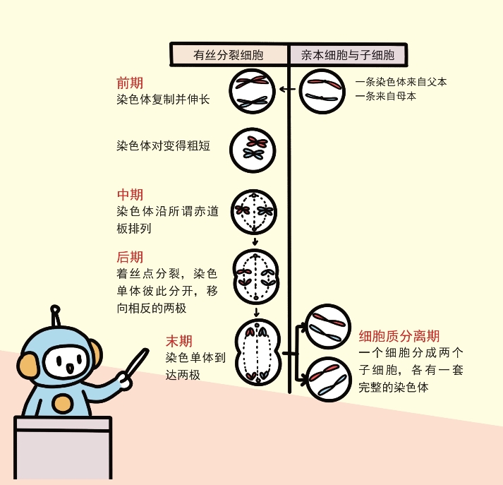 由右页示意图可见,体细胞的染色体在进行有丝分裂之前,父母的染色体先行复制,这样,就保证了分裂后形成的细胞(子细胞)中都含有一份父母的染色体。