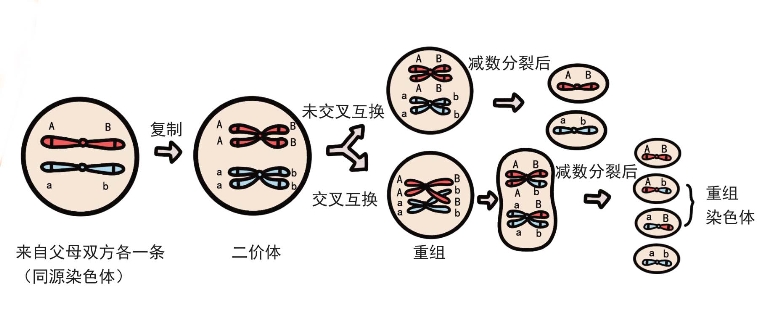 此外,在减数分裂过程中,在二价体阶段,父母双方的染色体有一条发生交换,结果是同一条染色体有些基因来自父亲,有些基因来自母亲,如下图所示。当然染色体交换不止发生在一处,因此可以形成包括各种基因的重组染色体,这样,子代在许多特征上有些像父亲、有些像母亲就不足为奇了。