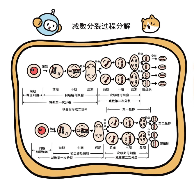 性细胞的形成则牵涉到另一类细胞分裂方式,即减数分裂。减数分裂过程大体与有丝分裂相似,性细胞的母细胞也是二倍体的体细胞,它在进行减数分裂之前,各条染色体也是先行复制。所不同的是,在第一次分裂初期,同源染色体彼此靠近,发生联会(配对),形成二价体,然后分别移向两极,细胞就发生分裂,形成两个各含有一对染色体的子细胞,然后这一对的两条染色体又移向两极,就发生第二次分裂,结果共形成四个子细胞,每两个各含有一条同源染色体。这样每个子细胞只有一套染色体,故是单倍体,它们成熟后即形成精细胞和卵细胞,是将来组成受精卵的一方,所以又称作配子。减数分裂是亲代将其性状传给后代的基础。