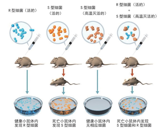 但是,DNA遗传决定者地位的确立,却并非靠其化学结构的推论。事实上,由于另一类生物大分子——蛋白质是由20种结构单位即氨基酸构成,而20种在表面看来显然比4种复杂得多,所以人们在探索遗传决定者的岁月里,长期踯躅于蛋白质与核酸之间。DNA遗传决定者地位的确立,像其他生物规律的确定一样,更主要的是靠实验证据。如果把具有某种遗传性状的生物的DNA提取出来,再转到没有这种性状的生物中去,后者便会获得此性状。这种技术叫作转化。DNA作为遗传物质的发现和证实,就是依靠这种技术。早在1928年,格里菲斯(F.Griffith)用肺炎球菌做实验。肺炎球菌有两种类型:一种有多糖夹膜,因此菌落形状比较光滑,称为S型(S是英文“光滑”的第一个字母),这种类型的肺炎球菌有毒,能杀死老鼠;另一种无多糖夹膜,菌落形态比较粗糙,称为R型(R是英文“粗糙”的第一个字母),对老鼠无毒。将高温灭活的S型的肺炎球菌给老鼠注射,老鼠却安然无恙;但若将高温灭活的S型细菌,加上活的R型细菌,一起注射到老鼠体内,老鼠却死去,而且可以从死老鼠体中分离出活的S型细菌。这就说明,煮过的S型细菌中的某种物质将活的R型细菌转变成了S型细菌。当时把这种物质笼统地叫作转化因子,因为那时虽然早就知道真核生物含有核酸,却不知道原核生物也含有核酸。后来,艾沃瑞(Avery)等先用死的S型细菌的各种无细胞提取物,如多糖、蛋白质和DNA,分别加到活的R型细菌中,然后再注射到老鼠体内,结果只有加S型DNA的一组能使老鼠死亡,而加蛋白质或其他成分的各组都无此效果。这是不是可以说DNA决定遗传呢?当然如此。转化技术不仅使人们认识到DNA是遗传决定者,而且是遗传工程技术的重要组成部分。我们都希望把生物的优良性状组合在一起,这就要使性状在生物之间进行转移,也就需要进行转化。