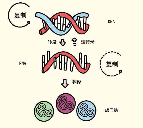 第二,必须说明的是,遗传信息从DNA经mRNA到蛋白质的流动过程,虽然是单向的、不可逆的,但也有个别特殊情况。一是RNA病毒,因为这类病毒没有DNA,所以只能是RNA自己复制自己。二是有一些RNA肿瘤病毒,在感染宿主细胞过程中,将其RNA逆转录(相对于DNA转录成mRNA而言)为单链DNA,然后单链DNA再变为双链,并结合到宿主细胞染色体中。