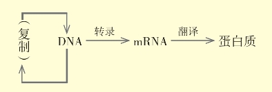 公式所表示的基因表达过程,在分子遗传学上叫作中心法则。更准确地说,中心法则的含义是,遗传信息单向地由核酸传给核酸,或由核酸传给蛋白质,而不能由蛋白质逆向地传给核酸。为便于理解遗传的分子基础,不妨对这一法则多说几句。