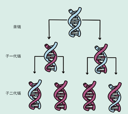 第一,关于DNA。不论是就个体中的细胞分裂还是就生物个体传代而言,DNA都要完整地传下去,否则就无遗传可言。但原有的DNA分子数量有限,又要保证传递时不走样,故DNA必须完整地复制自己,就如播下的小麦种子产生下一代小麦种子一样。DNA如何复制自己呢?我们在前面说过,DNA是由两条多核苷酸链构成的,在复制自己时,两链先分开,然后按照碱基配对原则,各自从核苷酸原料库中寻找自己的“配偶”,逐渐合成一条新链,结果一个DNA分子变成两个DNA分子,这两个子分子都与原先的母分子完全相同。从这一过程中,我们看到,原先母分子中的两条链分别进入两个子分子,也就是说,每个子分子的一条链,就是母分子的一半,所以DNA复制是半保留复制。从下页图可以看出,DNA每次复制均保留一条亲链,所以亲代的遗传信息可以代代相传。
