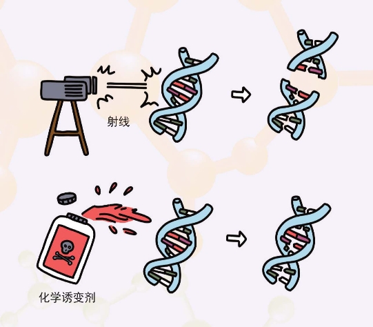为了人类的利益,往往需要人工造成突变,因此这种突变叫作诱发突变。产生突变的致因叫诱变剂,即诱导变异的因素。诱变剂有很多,大体分为两类,一类是化学诱变剂,一类是物理诱变剂。常用的化学诱变剂有烷化剂,如甲基磺酸乙酯(EMS)、甲基磺酸甲酯(MMS)和氮芥(HN2)等;有螯合剂,如原黄素、吖啶橙和ICR-170以及亚硝酸、硝基胍、5-溴尿嘧啶等。常用的物理诱变剂有β射线、γ射线、X射线、快中子、激光等。染色体或基因上发生突变的概率是否都一样呢?是否有些部位更容易发生突变呢?对突变发生点的统计分析表明,情况确实如此。突变发生是随机的,但并非完全随机,发生的位点基本符合正态分布,但又不完全相符。有些点可以发生几次突变,符合正态分布;但有些点发生突变的概率却比预期的高几十倍甚至百倍,这些点就叫作突变热点。然而,突变热点对不同类型的突变并非通用,而且不同的诱变剂因其引起突变的机制不同,可能有不同的热点。