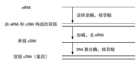 这里只谈从真核生物的染色体中如何分离出特定基因,原核生物的基因分离相对来说比较简单,就不谈了。从真核生物的染色体中分离出特定基因是一件非常困难的事,因为一个基因在整个染色体中含量极微,例如典型哺乳动物染色体有109个碱基对,而一个基因却只有1×103~5×103个碱基对,就是说,一个基因只占染色体DNA长度的1×10-6~5×10-6。其次,如前所述,真核生物的基因多是隔断型的,即在编码蛋白质的碱基序列之间常夹杂着非编码序列。这些困难告诉我们,捕捉一个基因犹如在万头攒动的人群中辨认一个逃犯,而且由于其隔断型性质,即使捕捉到了,也不易将其组装到负荷有限的载体上去。但办法总是有的,我们在基因表达一章中介绍了如何由基因产生相应蛋白质的过程,现在将这一过程反过来用于分离基因。我们可以通过蛋白质分析把具有某一性状的蛋白质找出,分离出含这一蛋白编码的mRNA,由此mRNA出发,便可合成决定这种蛋白质的基因。首先,我们以这种mRNA为模板,在逆转录酶作用下,合成互补的cDNA链,这时mRNA链与cDNA链构成双链。然后,再经碱处理把此双链中的mRNA降解,继而在DNA聚合酶的作用下,以cDNA链为模板合成互补的新DNA链,此双链DNA就是编码该蛋白质的基因。这一过程可用下页图表示。
