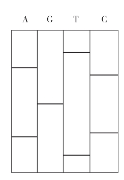 这里我们只介绍一种最简便的方法,即DNA链终止测序法,也叫引物延伸法,其名称的含义从下面的介绍中不难体会。此法的要点是,以转化体的一条单链DNA做模板,在测序酶(一种DNA聚合酶)的催化下,利用DNA合成原料(四种脱氧核苷酸,分别简称dA、dT、dC、dG,见前),合成一条与模板互补的新链。合成开始时需要一个人工合成的、与模板的一部分互补的引子(叫作引物),以便同模板的对应部分结合,启始新链的合成。如果在DNA合成原料中掺入双脱氧核苷酸(分别简称ddA、ddT、ddC和ddG),由于假原料同真原料极为相似,故可在合成中起到以假乱真的作用,使测序酶真伪难辨,而误将毒鸩当佳酿,把假原料组进新合成的DNA链,即所谓“假作真时真亦假”。而一旦掺入假原料,由于空间化学的原因,新合成的链便戛然而止,不再延伸,也就是说,DNA链的合成被终止。由于反应体系是由DNA分子群体组成的,所以新合成的DNA链有的是在离起点较近处终止,有的却在较远的彼处,从而形成大小不等、长度彼此连续的各种新链。这样,它们在高压电场中迁移(电泳)时,便会形成连续的电泳带。如前所述,DNA是由dA、dT、dC、dG四种核苷酸组成的,于是我们便可相应于四种原料设置四种反应,在各个反应中分别加入ddA、ddT、ddC、ddG,相应的反应就会分别在新链的理应掺入dA、dT、dC、dG的部位被终止。根据这四种反应电泳带的位置,便能读出DNA核苷酸的顺序。其情形如上页图所示。图中A、G、T、C分别代表测定DNA中dA、dG、dT、dC核苷酸的反应设置,从下向上,核苷酸链的长度逐渐增加,由此测出的核苷酸顺序是TACGCAT。