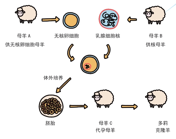 我们在回顾了20世纪60年代至21世纪初关于动物克隆的一些事例后,再来听听多莉羊的故事。在上面的例子中,以及后来有关牛、羊的胚细胞移植的例子中,供体细胞多数都是未完全分化的早期细胞。完全分化的细胞情形如何,是一个十分诱人的问题。长期以来,人们一直认为生长、分化和发育都会给体细胞基因组造成不可逆的变化或修饰,因而限制了体细胞的全能性。英国爱丁堡罗斯林研究所的威尔姆特(Wilmut)等在早期胚细胞核移植产生小羊的基础上,于1996年又有重大突破。他们分别以6岁龄雌绵羊的乳腺上皮细胞、胎儿成纤维细胞(系)和胚细胞为供体,将它们的核移植到母羊去核的未受精卵中。供体羊分别是芬兰多塞特、黑威尔士和波尔多塞特,受体羊是苏格兰黑脸。结果竟然也生出8只小羊,除1只来源于胎儿成纤维细胞的羊羔诞生后几分钟死亡外,其余7只都安然无恙。最引人注目的是来自乳腺上皮细胞的1只羊羔,实验编号为6LL3,即轰动世界的多莉。多莉取自威尔姆特所喜欢的一位乡村歌手的名字。经一种DNA多样性技术检测和外观形态的观察,多莉与供体细胞完全相同,而与受体迥异,特别是外观上,羊羔与作为“母亲”的苏格兰黑脸似乎完全不同,脸一点儿也不黑。这一结果之所以令世界注目,是因为实验供体是高度分化的乳腺上皮细胞,而不是尚未分化的(8个细胞前,即细胞发生三次分裂前)或刚刚开始分化的胚胎细胞(8~16个细胞的桑葚胚),从而证明,即使高度分化的细胞也具有全能性,而且它们未必发生不可逆的修饰。威尔姆特在羊身上再现了两栖类爪蛙的成功事例,确实是一件不简单的事。
