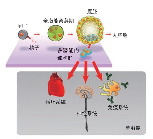 如右图所示,胚胎干细胞是由囊胚的内层细胞群产生的,这时对胚胎来说大约处在受精后的4~5天阶段,大约由59~150个细胞组成。这类细胞可以分化出200多种成人细胞类型,如果能剔除它们的一些坏基因,或增加一些好基因,就可以利用它们替换或修复损坏的器官或组织,所以应用潜力非常巨大,特别是对于再生医学。但是,由于科学技术和伦理学的障碍尚未解决,因此虽然对它研究了几十年,而且已经能够体外进行人工培养,但还未广泛应用于人类疾病治疗。2017年4月,中国首批胚胎干细胞临床研究项目才启动。