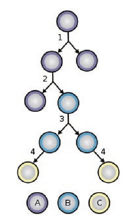 注:A-干细胞,B-原始细胞,C-分化细胞