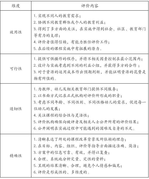 一般而言,课程内容包含各门学科中特定的事实、观点、原理和问题,以及处理它们的方式。课程内容是实现课程目标的重要手段,在选择和组织课程内容时,要考虑课程内容与课程目标之间的相关性,还要考虑课程内容本身的科学性和有效性,以及课程内容对儿童学习发展的意义、与社会实际之间的关系。因此,课程内容评价应围绕三种不同的取向展开:(1)课程内容对幼儿发展的价值;(2)课程内容的实现形式与幼儿发展特点之间的关系;(3)课程内容与幼儿已有经验之间的关系。课程内容的评价有助于教师从课程宏观架构出发,结合幼儿身心发展特点对课程内容的有效性、适宜性进行思考,确保课程符合幼儿发展特点,能够促进幼儿发展。