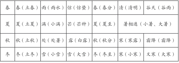 我们常说的二十四节气(Twenty-four solar terms)在《现代汉语大词典》中的定义是“根据地面观察太阳在黄道上的位置,将全年分成反映中国一定地区的季节、气候、农事活动和自然现象情况的二十四个时段”。二十四节气的名称按一年的时间顺序依次是:立春、雨水、惊蛰、春分、清明、谷雨、立夏、小满、芒种、夏至、小暑、大暑、立秋、处暑、白露、秋分、寒露、霜降、立冬、小雪、大雪、冬至、小寒、大寒。从二十四节气的命名可以发现,节气的划分同时兼备了季节、气候、物候等自然现象的变化。其中立春、惊蛰、清明、立夏、芒种、小暑、立秋、白露、寒露、立冬、大雪、小寒为“节”;雨水、春分、谷雨、小满、夏至、大暑、处暑、秋分、霜降、小雪、冬至、大寒为“气”,二十四节气就是“节”和“气”的总称。民间有《二十四节气歌》如下: