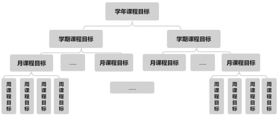 以时间维度划分的二十四节气园本课程目标可以从学年课程目标、学期课程目标、月课程目标、周课程目标来依次推进,在时间维度上层层推进,是一个由整体到部分、概括到具体的过程。如图5-2所示: