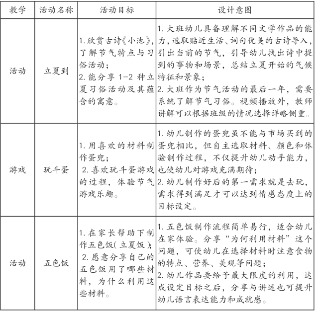 幼儿园的活动通常可以划分为教学活动、生活活动和游戏活动,活动的类型特征不同,相应的课程目标也有所区别。首先,教学活动更加强调课程目标设置的逻辑性与连贯性,注重幼儿的一般性发展。同时课程目标注重幼儿的自我探索与知识建构,将幼儿对自我、自然、社会的认识统整起来,形成一个相互联系的知识网络,注重目标的系统性与整合性,关注幼儿的特殊性与个性发展。其次,游戏活动在节气传统文化园本课程中作为教学活动的有力补充,更加注重幼儿的体验与情感感受,将节气传统文化渗透于幼儿游戏活动,在轻松互爱的氛围中获得能力的提升与情感态度的升华。最后,节气课程中的生活活动是幼儿形成自我概念、掌握自我服务技能、获得独立感与自信心,通往更高层次学习目标的基石。课程总体目标的实现不仅依赖于教育活动和游戏活动,更应该从幼儿的实际生活出发,充分利用好蕴含着丰富教育契机的生活平台。二十四节气传统文化园本课程中“节气与自我”以大班“立夏”节气为例(表5-4),其很多目标都可以在生活活动中得以实现。