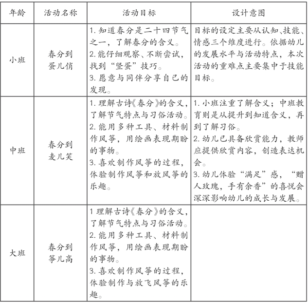 二十四节气传统文化园本课程是贯穿幼儿园三年的连续的教学活动,小、中、大班的课程目标既应该呈现出相互联系、不断发展的递进性,又应该体现出根据每个年龄阶段幼儿身心发展特点,目标有所侧重的阶段性。以“春分”节气为例(表5-3),春分这一节气可以挖掘出来的活动资源有很多,如:节气本身的含义、物候特征、民间活动等,可选取适合学前阶段的内容,利用丰富有趣的活动形式,让幼儿真切体会和感受春分节气与我们生活息息相关。小、中、大班是时间轴纵向上的连接,课程设计上不应是“春分到,蛋儿俏”的简单重复,而应是由“简单有乐趣”到“丰富有意义”的一个连续却不单调的过程。虽然每次的活动都以领域为载体,但绝不是机械地讲解与教学,应注重幼儿认知发展的同时兼顾技能与情感的发展符合时代发展的需求。