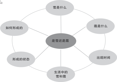 活动课程一般以幼儿的需要与兴趣为中心,重视活动对幼儿思维训练的重要性,强调教师的任务就是为幼儿提供学习与探究的机会,使幼儿通过对已经学习的实例加以运用或补充所学内容的相关活动,自发地去发现和掌握知识。这类组织方式强调学习者应全面发展并具有改善生活的能力,课程的内容与素材是由学习者在具体的情境中合作,强调学习情境的变化与学习成果的多样化。教师的角色为顾问及引导者,教学方法多采用以学生为中心的问题解决方式。在二十四节气传统文化园本课程内容的组织当中,要求教师从对教材的依附中解放、幼儿从对教师的依赖中解放。探究取向的活动课程是以幼儿的需要与兴趣为基础,由教师与幼儿共同建构和生成的。例如,在大雪后的一天,幼儿发现小区和幼儿园外面的草地上都是白茫茫的一片,大二班的幼儿对“这是雪还是霜?”展开了讨论,教师根据幼儿的兴趣,展开“是雪还是霜”的主题探究活动,如图5-4所示: