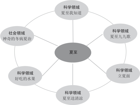 学科课程一般以学科内容为组织的中心,这种组织形式包括了单一科目形式、相关课程形式、融合课程形式和广域课程形式。幼儿园中主要是以健康、社会、语言、科学、艺术这五个领域为基础。二十四节气传统文化园本课程内容以五大领域为中心的组织形式集中体现在幼儿园的集体教学活动中。如,小寒节气针对各个领域开展不同的教育活动,科学领域的“了解小寒”、语言领域的“小寒诗歌《山中雪后》”、艺术领域的“蜡梅图”、社会领域的“一起来过腊八节”、健康领域的“雪地游戏”等。在夏至节气开展科学活动“夏至我知道”、语言活动“夏至诗词、夏九九歌”、艺术活动“立夏面”、社会活动“神奇的冬病夏治”、健康活动“好吃的水果”等。如图5-3所示。