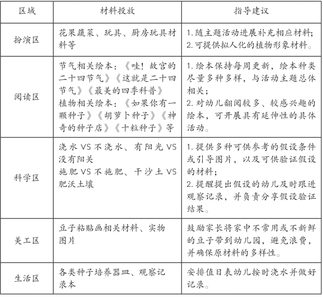 活动背景:谷雨是春季的最后一个节气,在谷雨节气期间,中二班开展了“我们是农民,一起来播种”的主题探究活动。本次主题活动围绕节气特征与种子生长开展多种活动,教师为保障相关活动的顺利进行与实施效果,提前将活动室中的各个区域进行相应的调整与完善,并制定了区域指导建议,为幼儿的主题探究活动提供材料空间与环境氛围的保障。