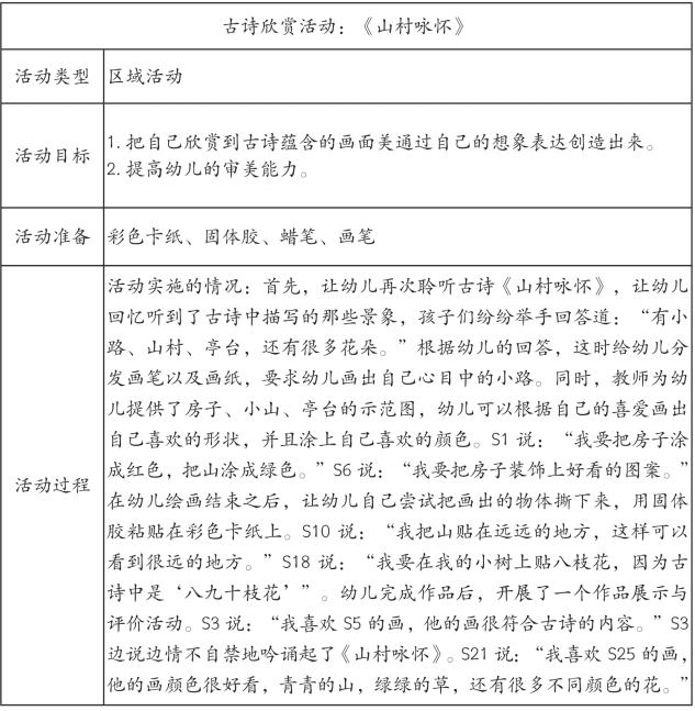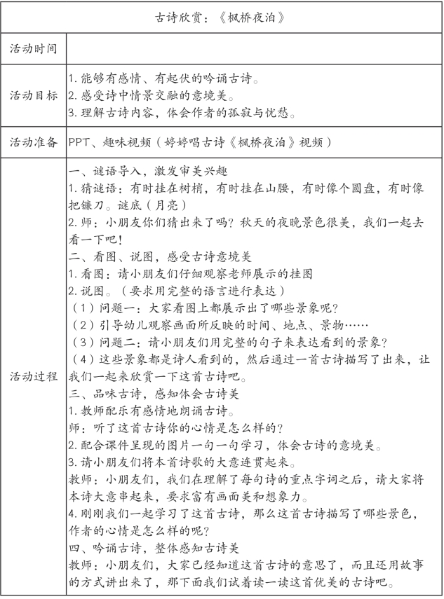 活动分析(表6-4):《枫桥夜泊》描写了一个秋天的夜晚,诗人夜泊苏州城外枫桥的所思所想。在教学活动的过程中,教师可用图片、音乐引导幼儿欣赏落月、啼乌、满天霜、江枫、渔火等意象,创造一种意蕴浓郁的审美情境,让幼儿体验感知古诗空灵、旷远的意境美。