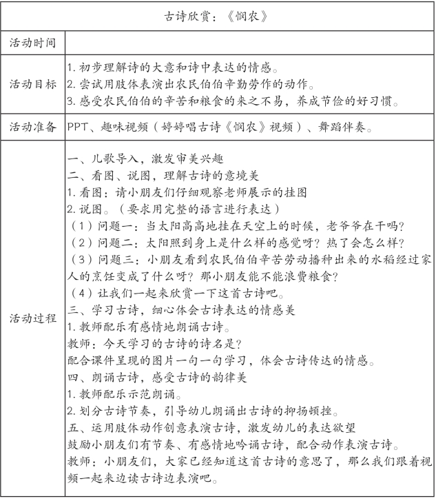 活动分析(表6-5):《悯农》是幼儿十分熟悉的一首古诗,诗人在古诗的前两句细致地描写了农民在广大的田野里春种秋收等繁重劳动的辛苦,尤其是把粒粒粮食比作滴滴汗水,真是体察细微,形象贴切,表达的情感真挚细腻。在教学过程中,教师根据幼儿的日常生活经验引导幼儿创编古诗中的动作,让幼儿更能深切地体会诗人所要表达的感情。
