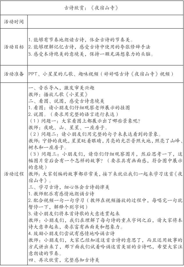 活动分析(表6-3):古诗《夜宿山寺》是诗人李白夜晚住在一个深山寺庙之中,发现寺庙中的藏经阁后登楼眺望,发现满天星辰闪烁,之后写下了这首古诗。根据本诗的意象,可在古诗导入环节选择幼儿熟悉的儿歌《小星星》进行导入,激发幼儿的欣赏兴趣,在古诗的欣赏过程中,采用示范朗读、划分古诗节奏和为古诗配乐朗诵等方式,让幼儿更好地掌握本首诗的吟诵节奏,体会古诗蕴含的韵律美。幼儿在跟随音乐一遍遍的吟诵中,爱上吟诵古诗,体会古诗的美。