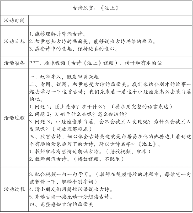活动分析(表6-2):古诗《池上》是白居易晚年所作的一首诗,该诗记录了小娃娃偷采白莲被发现的趣事。幼儿根据教师出示的图片,眼前浮现出夏天的午后,可爱、俏皮的小孩子在莲花绽放的池塘里偷采白莲,为了不被发现撑船溜走的画面。幼儿在欣赏本首诗的过程中,特别喜爱小娃娃的可爱可亲。在实物展示环节,孩子们的积极性很高,愿意进行操作。孩子们在欢声笑语中感知体验这幅生动活泼的生活图景。