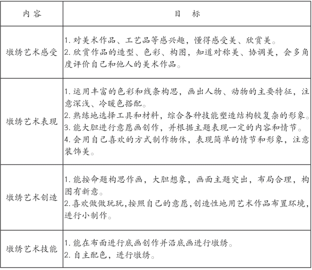 幼儿园开展墩绣艺术活动课程目标的建构是幼儿园墩绣活动的基础与依据。幼儿园墩绣艺术活动课程目标主要分为两方面: